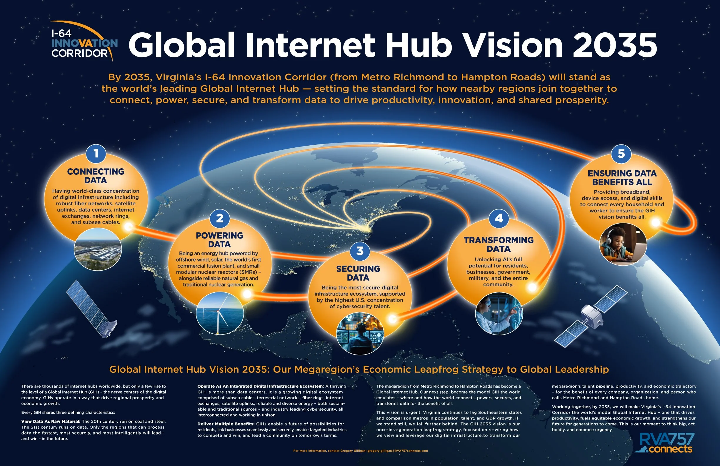 By 2035, the I-64 Innovation Corridor from Metro Richmond to Hampton Roads will stand as the world’s leading Global Internet Hub — setting the standard for how nearby regions join together to connect, power, secure, and transform data to drive productivity, innovation, and shared prosperity.